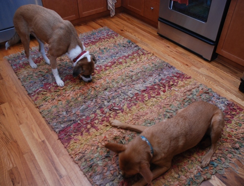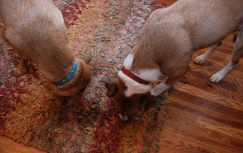 Ok, I don’t know how to spell dogs vomiting, but that’s totally what was happening. Then we saw the grossest thing ever: Maggie and Pumpkin way too happily eating the entire block of cheese Maggie had surreptitiously swiped from the counter, devoured–plastic wrapper and all–and then immediately expelled. Gross! We scrambled to clean that up, but Maggie was all like, “No worries, Mom, we’ll just chew on this here vomit-flavored rug.” Mmmm puke.