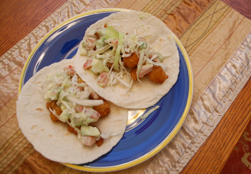 When I was complaining about cabbage to JVV’s friends on facebook (I don’t know why y’all are still my friends, I am so cranky), lots of folks offered up some really great ideas, but most of them involved cooking it in ways that would make the cabbage too closely resemble my nemesis, the onion. To me, cooked cabbage looks like onion’s red-headed stepsister, and I was pretty sure I wasn’t woman enough to take her on. Then I remembered rhu-Barb saying somewhere, sometime, something like, “You could always just add shredded cabbage to shrimp tacos.” Mmmm. Tacos. Voila. Thank you, rhu-Barb.